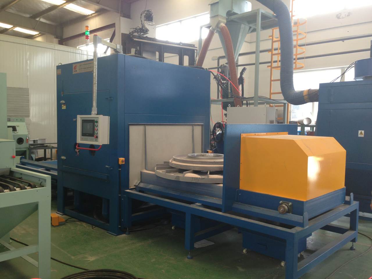 2.3.2主要設(shè)備結(jié)構(gòu) 主要由主機(jī)噴砂室、轉(zhuǎn)盤轉(zhuǎn)動機(jī)構(gòu)、噴槍擺動機(jī)構(gòu)、臺車、電控系統(tǒng)等組;
